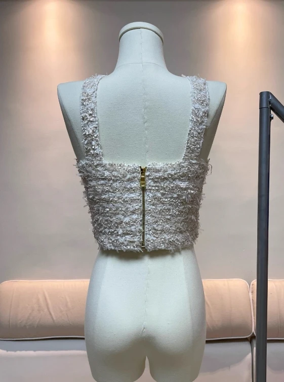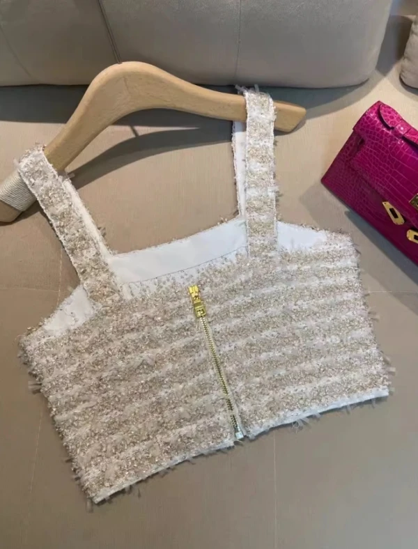 Beige Striped Tweed Crop Top | Hinata – XG