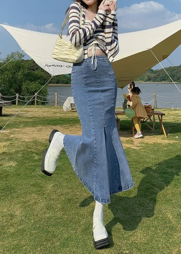 Be the first to review “Blue Front Slit Flared Denim Skirt | Sihyeon – Everglow” Cancel reply