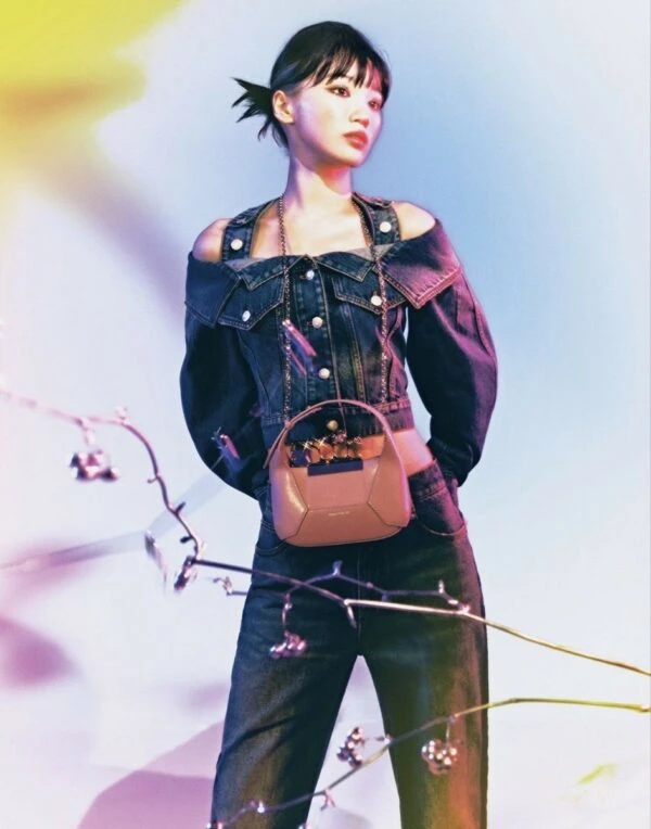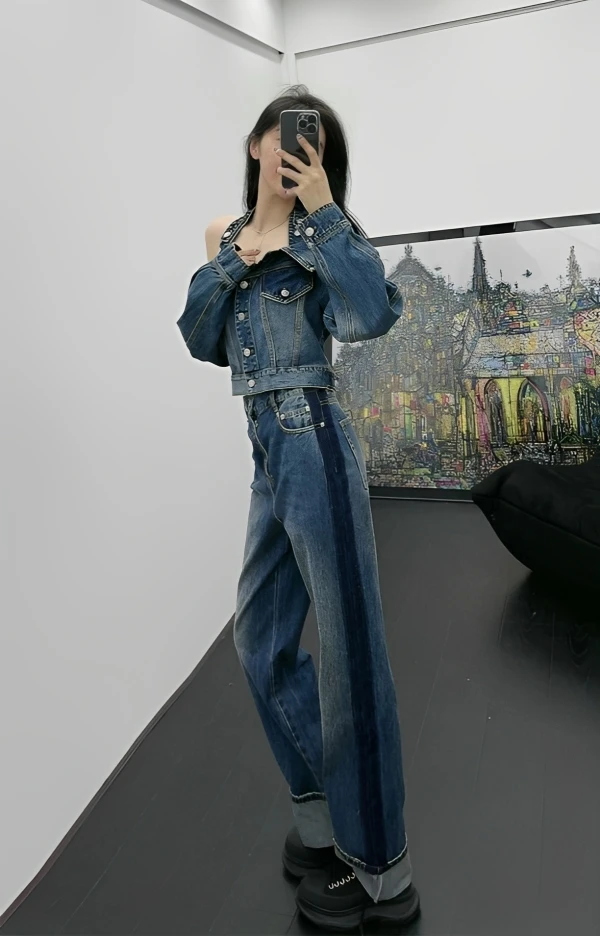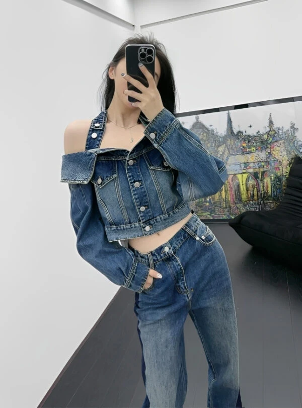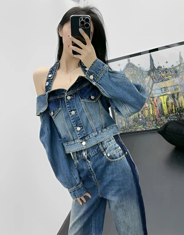 Blue Halter Neck Off-Shoulder Denim Top | Chaewon – Le Sserafim
